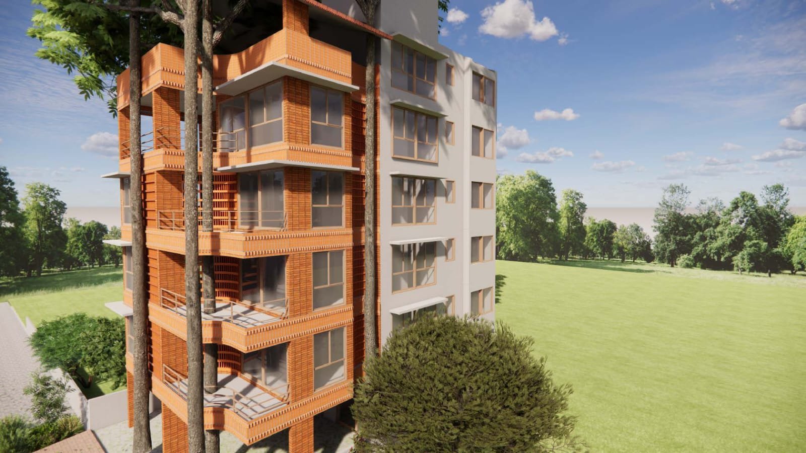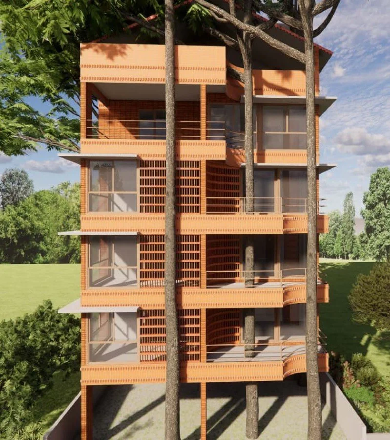 An upcoming multi-level residential project that redefines urban living by seamlessely weaving architecture around nature. Designed to preserve and celebrate the site's mature trees, the structure rises gracefully with each apartment occupying a single floor, offering residents the privacy and comfort of an independent home. Large floor-to-ceiling windows and expansive balconies invite abundant natural light, while strategic cross-ventilation ensures a cool, breezy interior spaces year around.The building's signature jaali brick façade creates a fun play of light and shadow, filtering sunlight and allowing fresh air to permeate living spaces the warm terracotta tones harmonize with the lush green canopy.